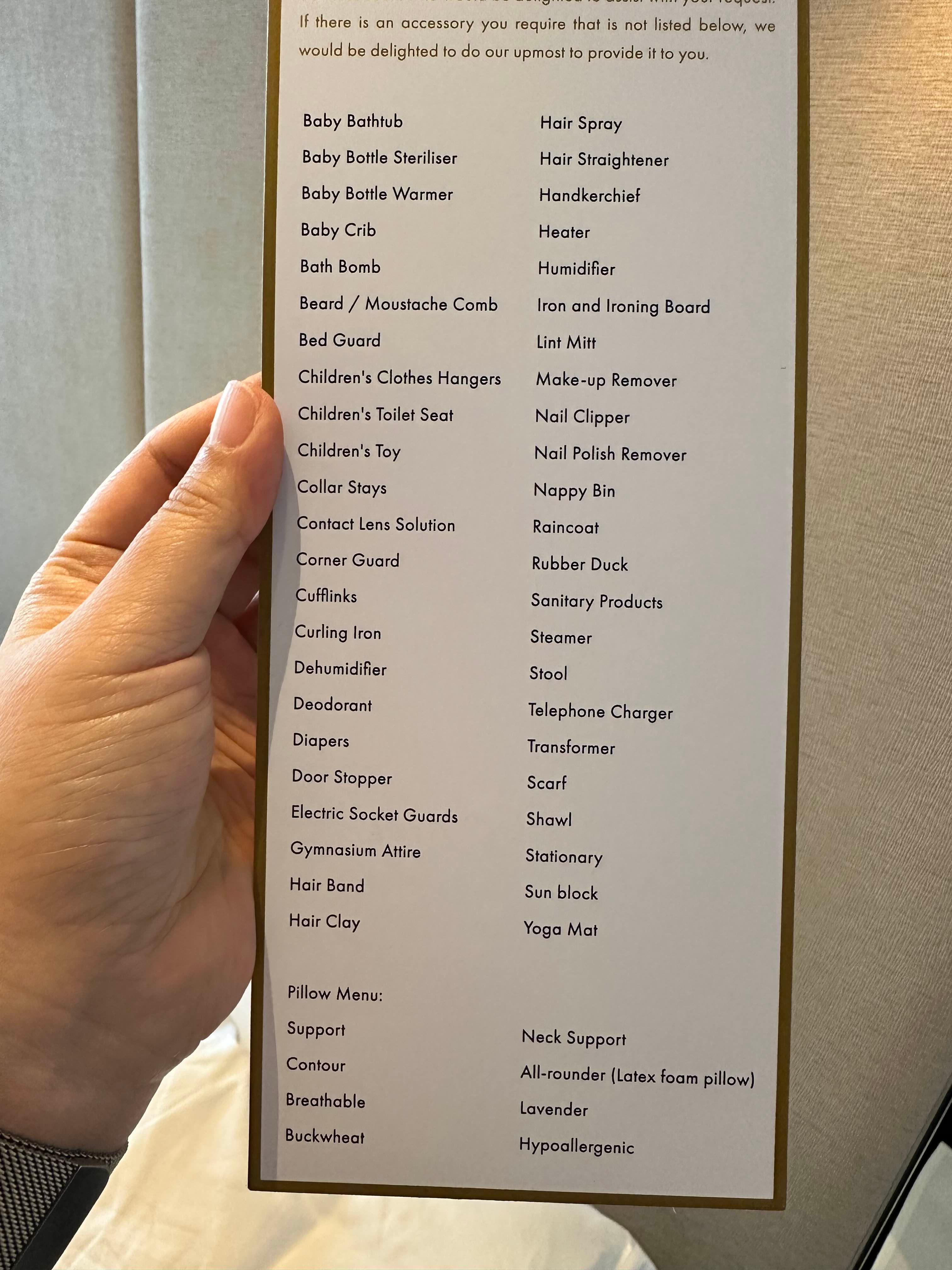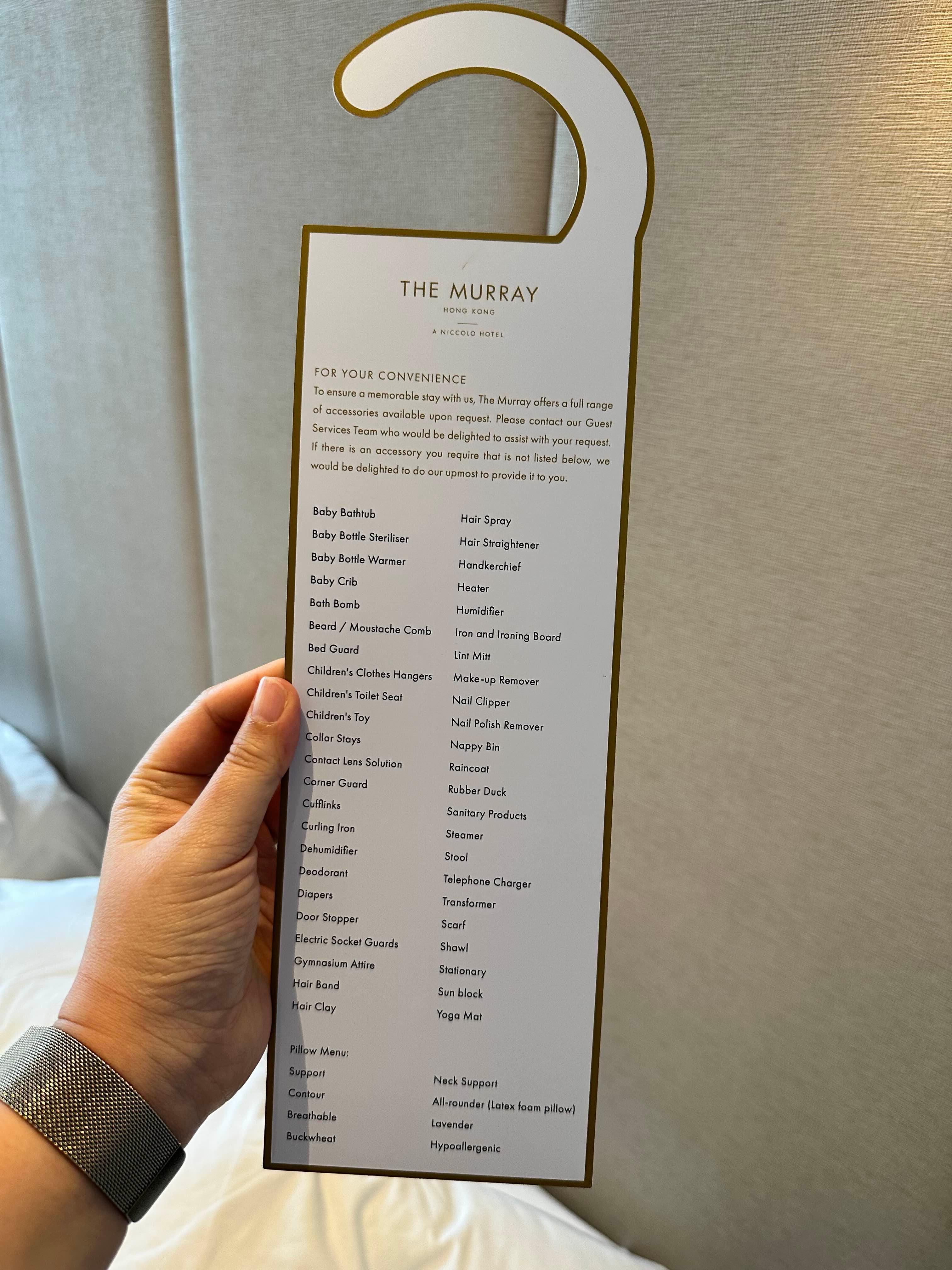 그리고 또, 더 머레이 홍콩에서 투숙객에게 제공하는 물품 리스트. 진짜 많다. 그냥 빈손으로 갑자기 홍콩에 오게 된다면 꼭 더 머레이에 묵어야겠다.